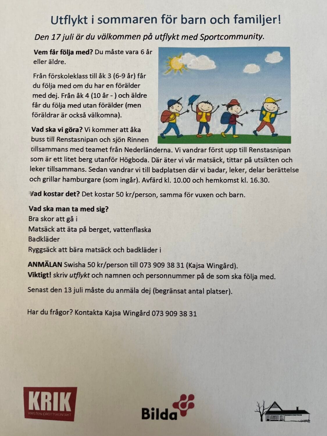 Sport i gränderna, ungdomskväll i kyrkan, utflykt till berget Renstasnipan och sjön Rinnen samt festkväll! Läs mer nedan:
