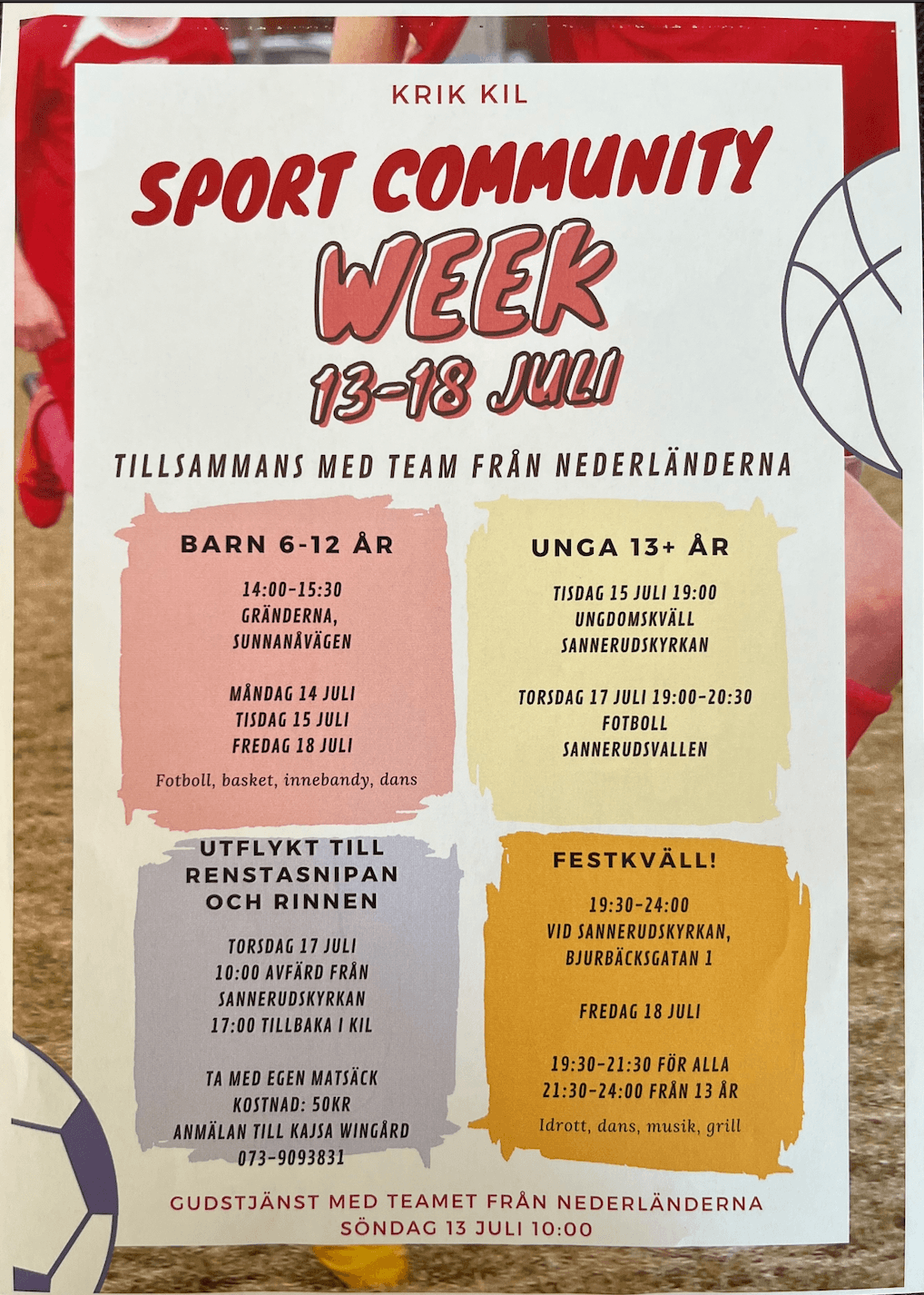 Under veckan 13-18 juli kommer det vara olika aktiviteter för barn och ungdomar tillsammans med Sports Community och ungdomarna från Nederländerna, som tidigare besökt oss i Kil.